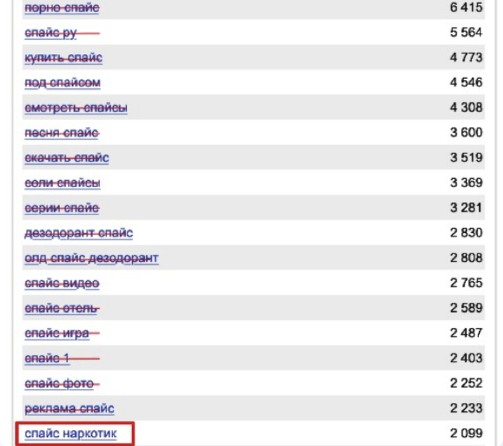Поэтому мы брали слово «спайс» и минусовывали всё, кроме относящего к лечению зависимости от спайса (минусовать приходилось ≈99%). За счёт таких манёвров смогли обойти запрет Google и запустили там рекламу.