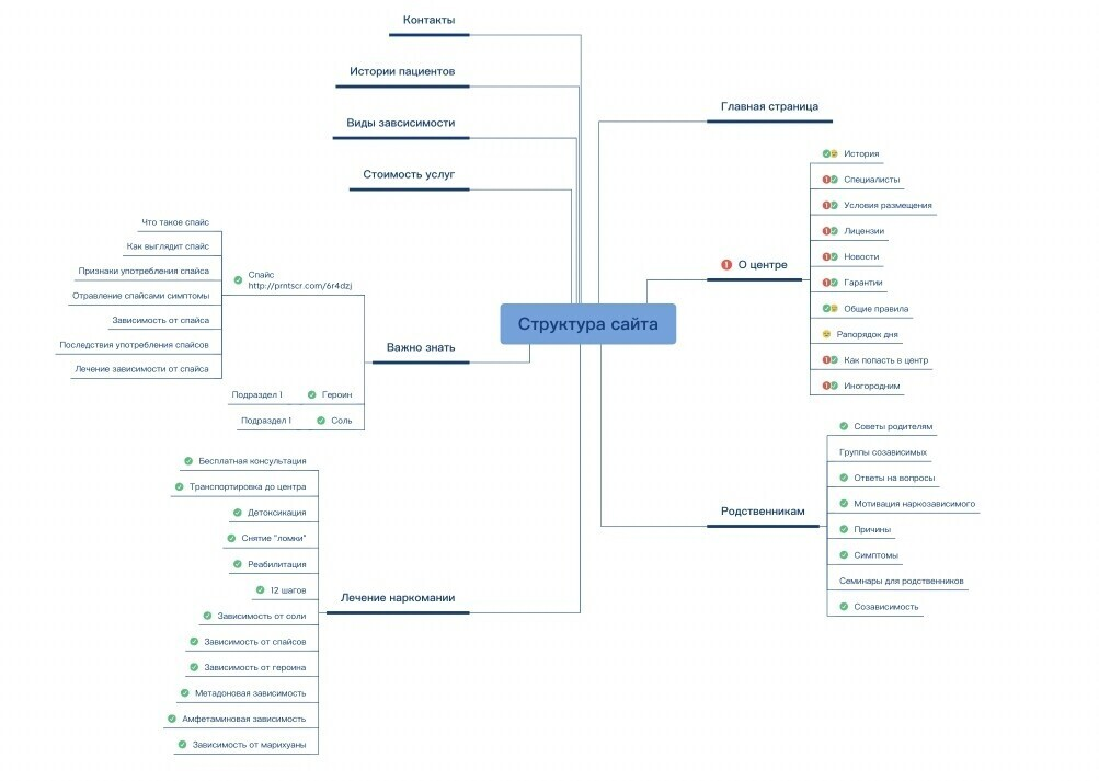 Люди ищут услугу очень по-разному, некоторые ищут не услугу, а решение, что делать столкнувшись с проблемой. Получилась огромная карта семантического ядра, чтобы мы смогли охватить всю тематику в целом.