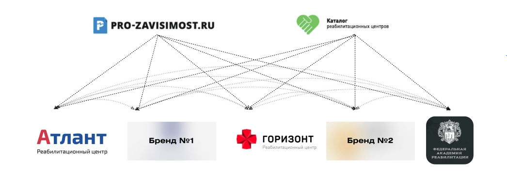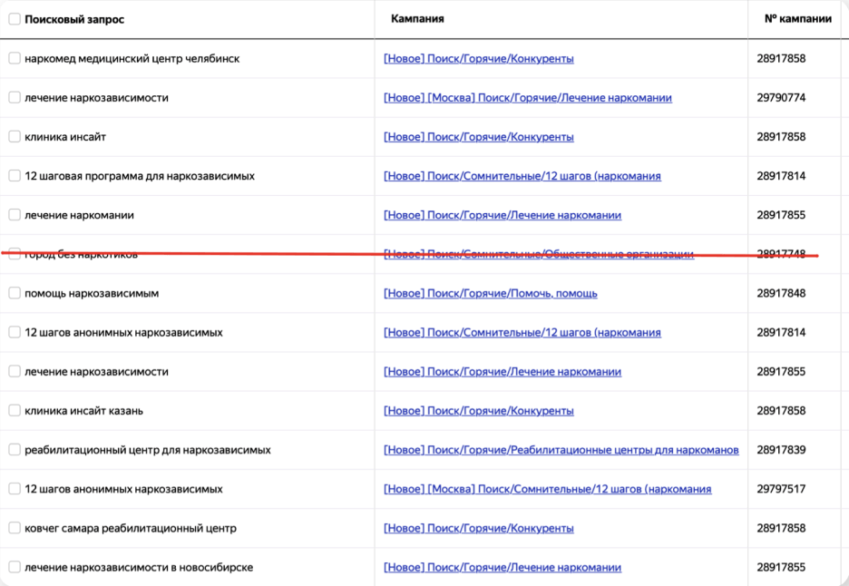 Взяли названия всех компаний конкурентов по России (800 шт), все вариации написания этих названий, написания их доменов, и добавили их в качестве ключевых слов для показа рекламы, потому что в этой тематике много сарафанного трафика, когда люди по рекомендации ищут конкретный реабилитационный центр.